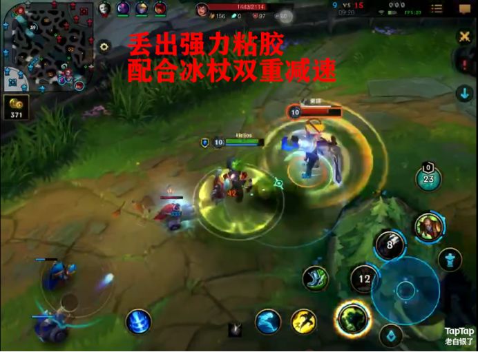 盖伦落地后老白又使出2技能,把强力粘胶播撒在盖伦脚下,用缚地和配合冰杖的双重减速将他困在毒雾区里动弹不得。