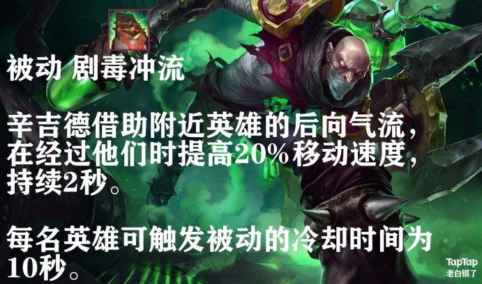 辛吉德的被动技能剧毒冲流让他在经过英雄的时候获得加速效果,队友和敌方英雄都可以触发,但每个英雄能触发被动的冷却时间有10秒。对于主要靠1技能放尾气来打输出的辛吉德来说,移速是很重要的属性,而辛吉德的被动能够让他在战斗中尤其是大规模团战中发挥重要的作用,配合大招和其他提高移速的装备更是能体验到千速的快感。