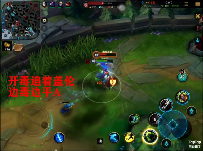 强力粘胶持续时间结束后,被困在毒雾区的盖伦已经下到半血以下,转头给了老白一个沉默赶紧逃跑。老白继续开着毒雾追击盖伦,边利用自己身边的毒雾毒盖伦一边平A。