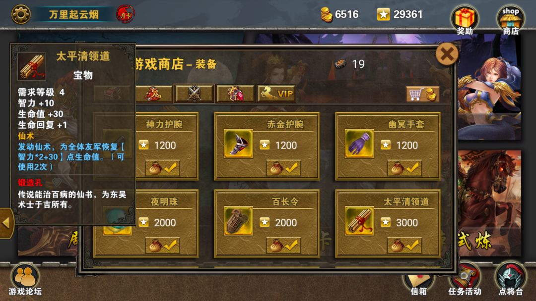 太平清领道,智力+10,生命值+30,命回+1,可给全体友军回复智力*2+30生命。