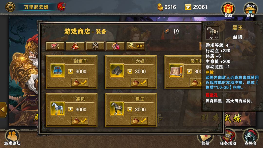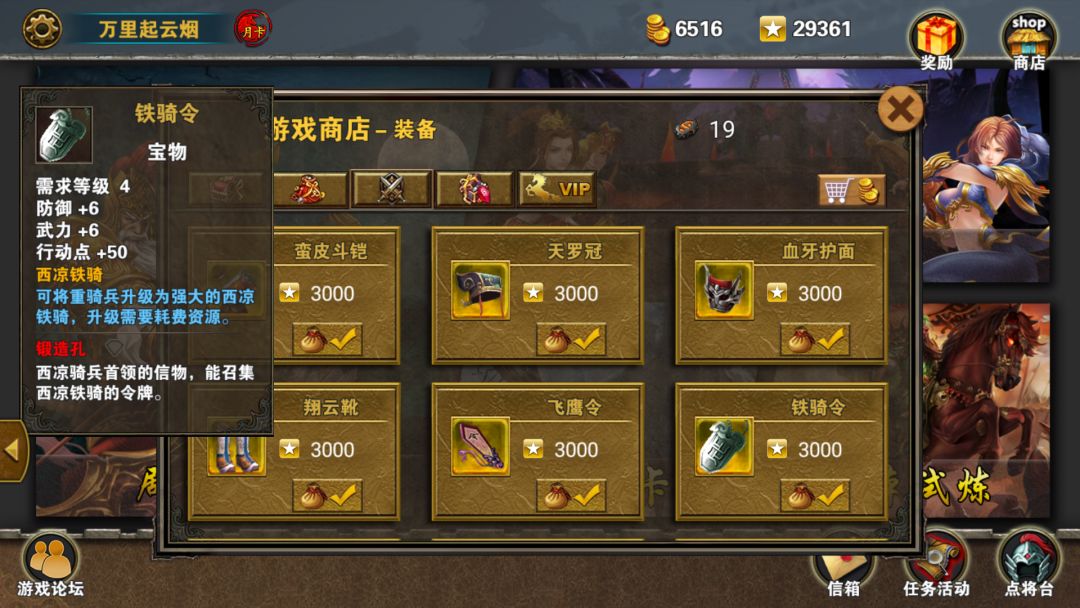 铁骑令,武力防御各加6,行动点加50。可将重骑兵升级成西凉骑兵。