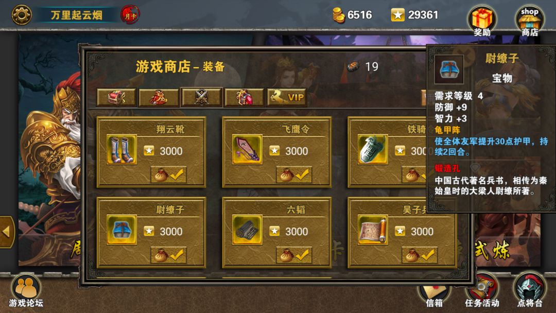慰缭子,9防3智,使全军加30甲持续2回合。