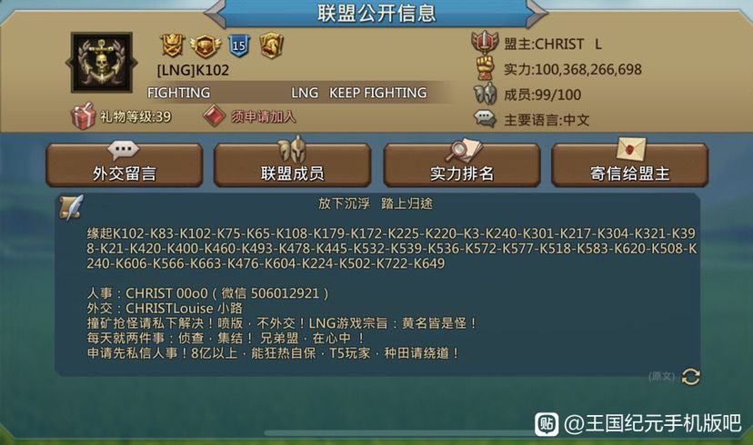 LNG老牌战斗盟 招收战犯!招收集结手!招收填兵手!盟内满堡橙决、顶级散橙900+ 850+ 多位带队,不定时组织多集结锤人 !常年战区活动!月月移民找肉、月月争战霸主。作战经验丰富!无大阵营,天天可体验集结吃肉的乐趣!欢迎各种叨扰!