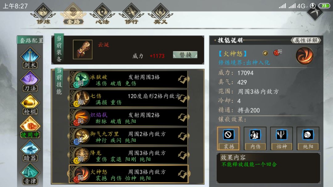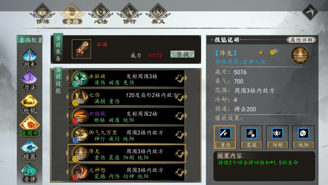 主心法纯阳无极功(九阳+纯阳),副系南明离火诀(带武道连斩)、龙象般若功(无量触发超高伤害)、万道森罗(六个技能除了降龙外面板伤害暴涨)。