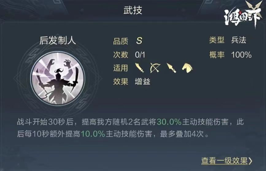 效果分析:后发制人的整体效果需要在战斗30秒才可触发,在70秒时加成会达到顶峰的70%,考虑武技的释放机制和每场对局的时间,更适合于提升CD较短的技能。最好将该技能给队伍中的功能性武将使用,让输出武将配置两个输出技能达到最佳强化效果。更多进阶攻略,各位主公可以关注《鸿图之下》TAP社区官方了解~