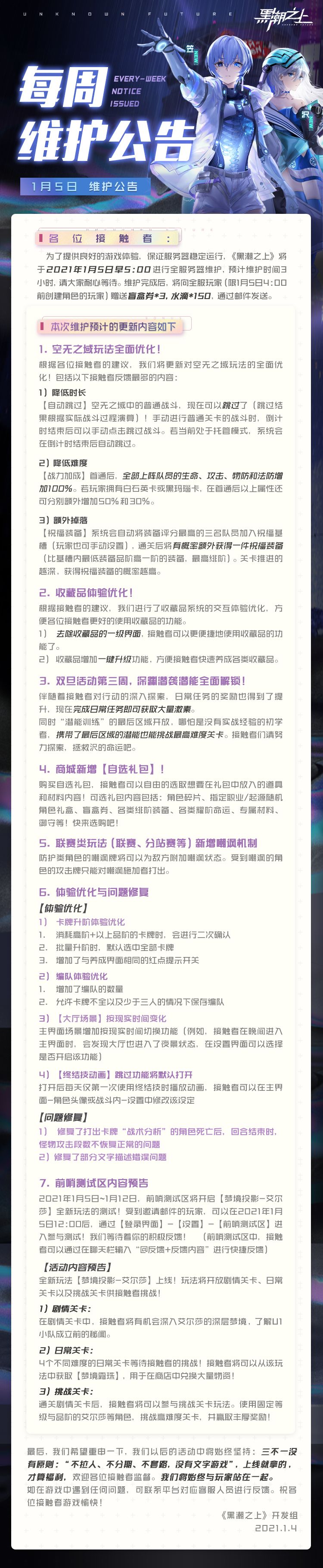 为了提供良好的游戏体验,保证服务器稳定运行,《黑潮之上》将于2020年1月5日早5:00开始进行全服务器维护,预计维护时间3小时,请大家耐心等待。维护完成后,将向全服玩家(限1月5日4:00前创建角色的玩家)赠送盲盒券*3,水滴*150,通过邮件发送。具体详情,请接触者戳下方长图查阅↓↓↓