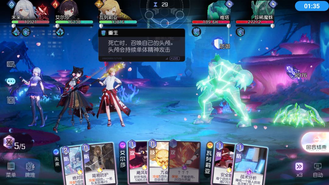 BOSS特性:头颅,BOSS死亡之后会召唤骷髅继续作战,如果3回合无法击杀骷髅头,BOSS则复活。