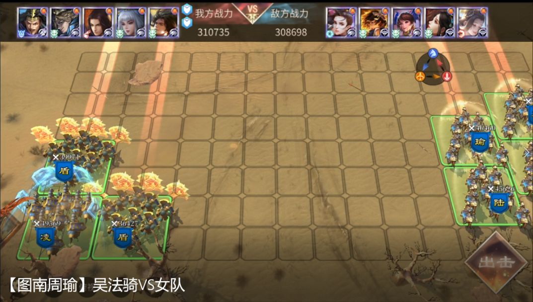 三军:大盾×2弓骑的弱点是被集体近身后生存得到威胁输出得到遏制,在图南周瑜被动的帮助下,可在一段时间内有效规避此情况。除此之外,在对阵其他阵容时,只要适时地释放技能就有取胜的可能。