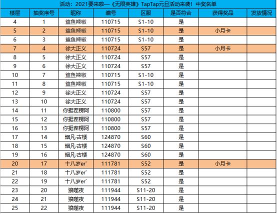 感谢各位勇士的踊跃参与,我们的TapTap论坛活动【2021要来啦—《无限英雄》TapTap元旦活动来袭!】圆满结束了,以下是各位幸运的中奖玩家名单: