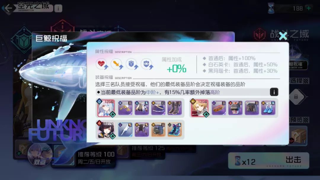 简单来说就是首通可以拿到100%的属性提升,并且如果你是月卡玩家还有额外的加成。其次可以在祝福下方选择三个角色,系统会根据你角色装备品阶增加高一品阶装备的额外掉率。(tips:现在双旦双倍掉落!)