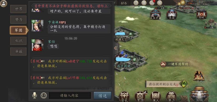 借力发挥,一举拿下阿蝉在这里提醒各位,如果提前预知在规定时间内无法攻下城池,大可在军团频道中请求支援,或许会有神兵天降,帮助大家拿下这座城池哟~