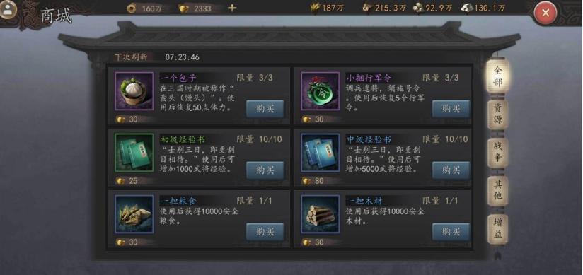 军团商店中有丰富的商品种类,但每日出售的商品库存有限,军团成员可以在军团商店中购买城战令、急行鼓、撤军锣等商品,能为攻城战的成功添砖加瓦。主公们要注意,军团成员在军团商店中购买某项道具时,有限定的购买次数,商品的库存和购买次数将会每日刷新。