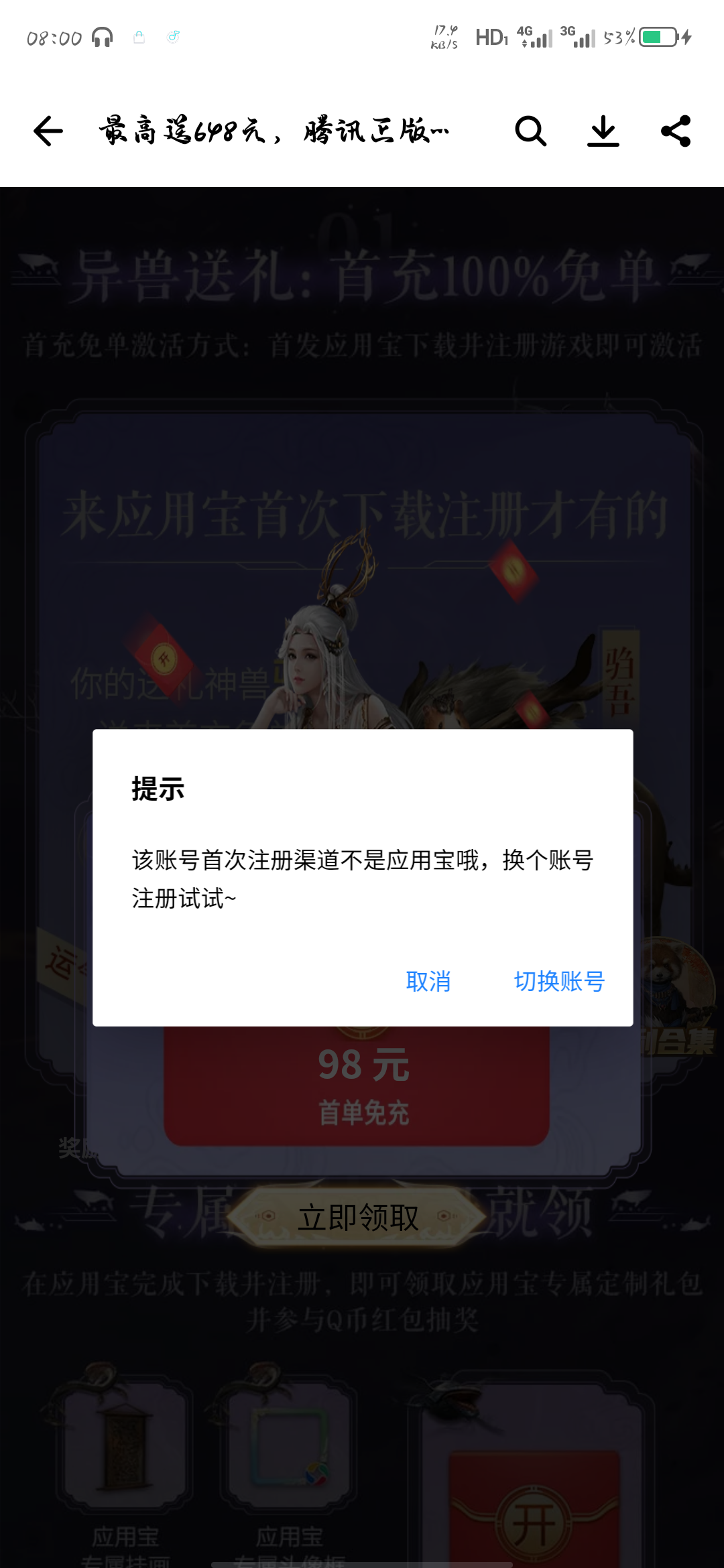 应用宝下载注册无法领取礼包