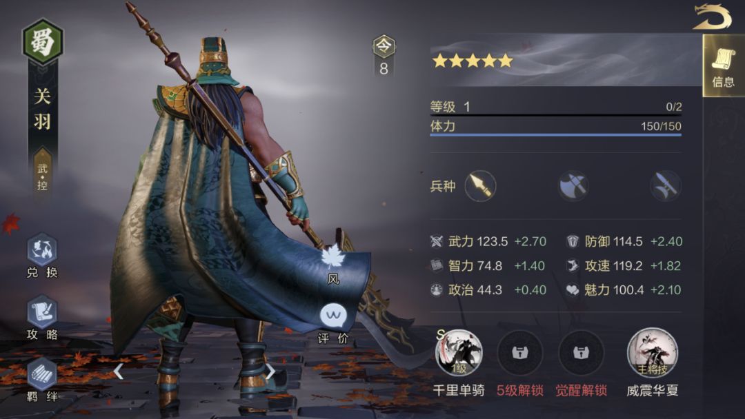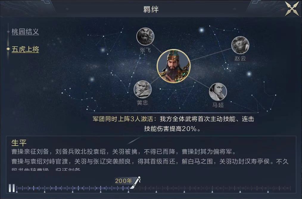 点开羁绊,关羽共有与刘备、张飞组成的桃园结义和张飞、黄忠、赵云、马超等人组成的五虎上将两个羁绊,桃园结义表明了刘关张三人结拜肝胆相照、共闯天下的决心,五虎上将则是蜀国最强战力的合称,五人在刘备建立蜀汉过程中起到了至关重要的作用,这两个羁绊都是三国中的著名典故。