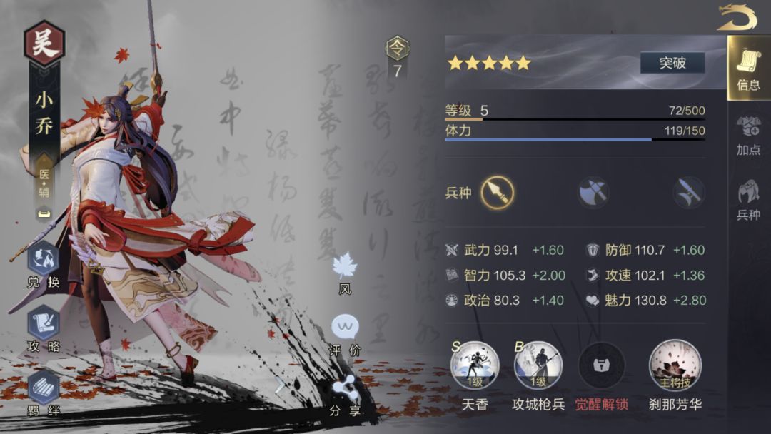 在三国历史中,小乔为周瑜之妻,与姐姐大乔因美貌而闻名天下,并称“二乔”,《鸿图之下》在尊重历史的基础上将人物特点融入武将技能中,大小乔自带技能为“国色”与“天香”,让人在玩游戏之余回味起那些脍炙人口的三国故事。