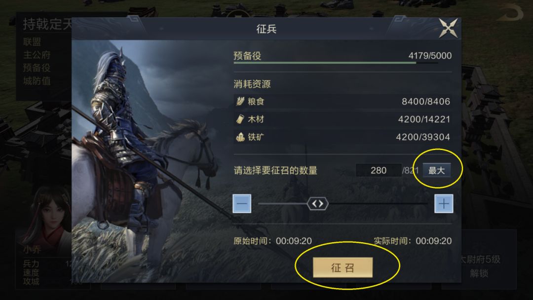 蓝色:预备兵,每个玩家都有自己的预备兵所,平时打地一定要注意去补兵,尽量保持征兵状态(点击地图中心主城,选择进城,会出现下图所示页面。点击征兵,在弹出的页面中进行征兵操作。)