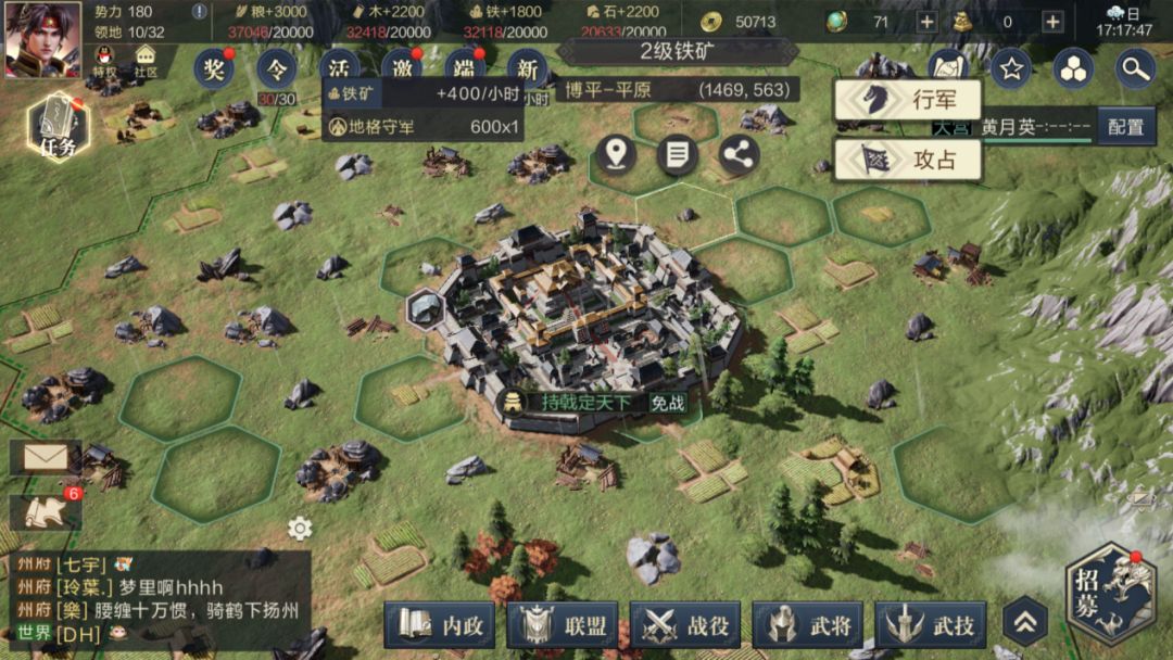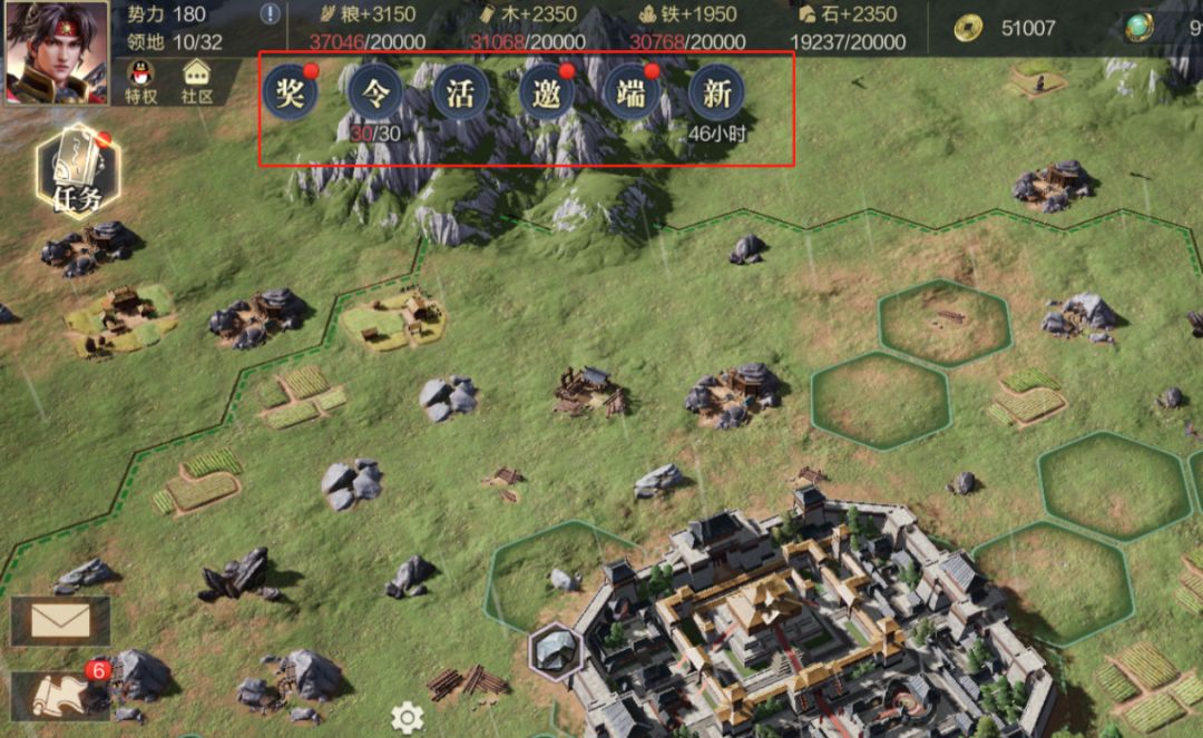 简而言之,在刚进入游戏阶段需要利用好新手保护期,拿到更多的资源来提升建筑,如果不知道该拿什么,可以通过点击主公头像下的任务手册来完成任务,也可以快速积累资源和名望,从而扩大自己的占地数量。