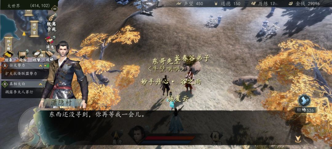 忘记这个长春谷弟子想要什么东西,他就永远站在那里傻等。建议增加一项对话内容,说明他的任务需求。