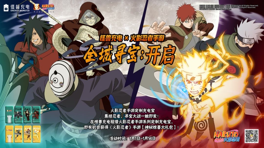 2021年1月1日起, 【火影忍者手游】联名【怪兽充电】推出全新“火影忍者手游定制宝”,并开启为期两周的“全城寻宝活动”