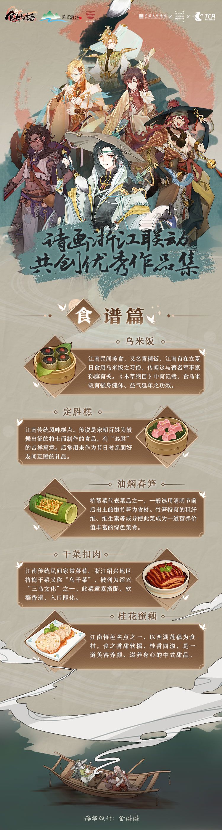 在本次“诗画浙江 · 百县千碗”的联动合作中,食物语亦携手中国美术学院共同探索美食背后承载的文化内涵。以江南美食、古人、古诗词与古画间的关联作为灵感源泉,创作出同人食魂设定立绘,时装及食谱作品,以美食为载体,弘扬中华传统文化!