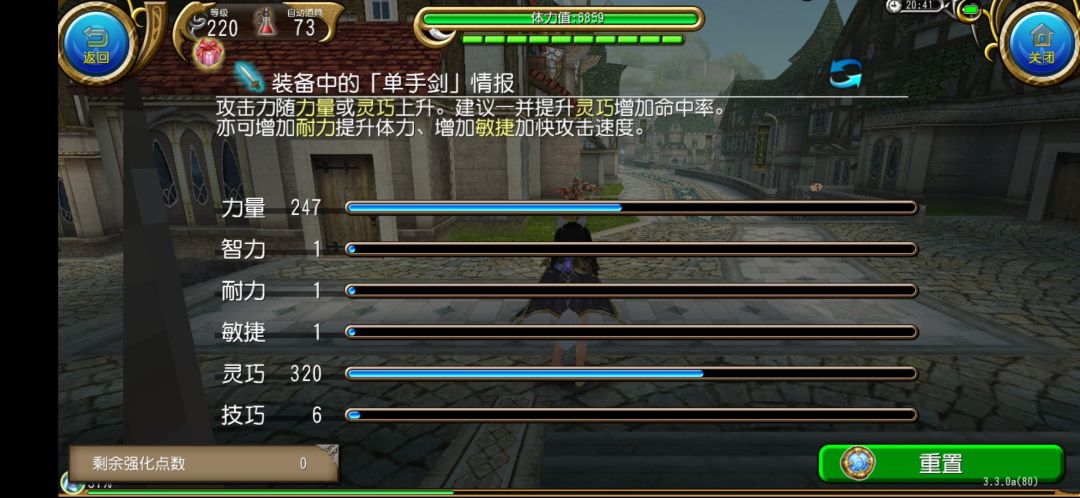 220版本,灵320力247技6,剩下五点多出来的物尽其用点技巧。这样可以略微提升锻造等级(2:1)。