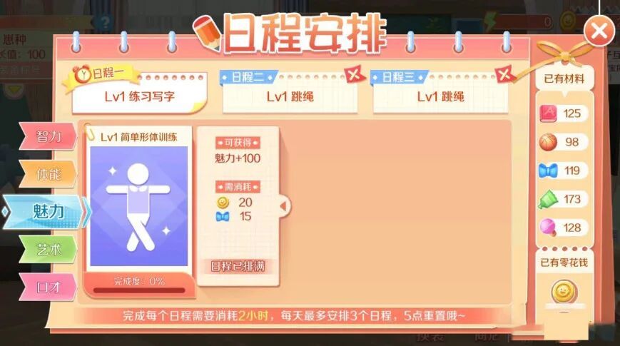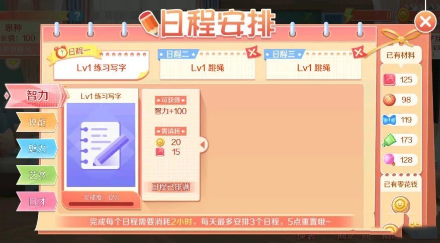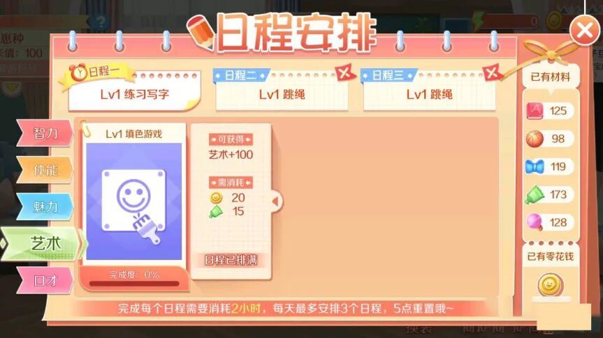 66小tips:完成每个日程需要消耗2小时,每天最多可以给宝宝安排3个日程,每日5点将会重置日程噢~