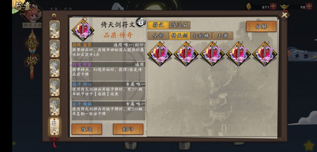 豪侠叠甲,倚天运气不错,给回马枪同时上了疯狂连携;打狗棒有个紫色无狗,并且第一次使用给了祭坛拿了多抽牌;12层祭坛摸了吸血