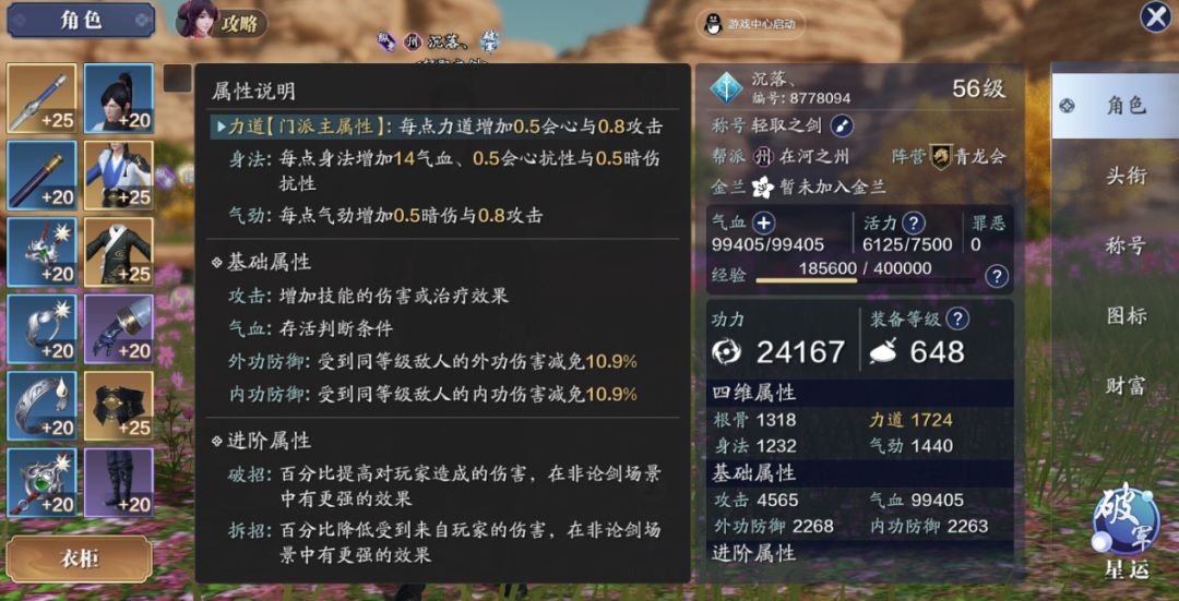 门派是太白所以我的特色属性就是力道(门派特色属性会边位金色提醒)