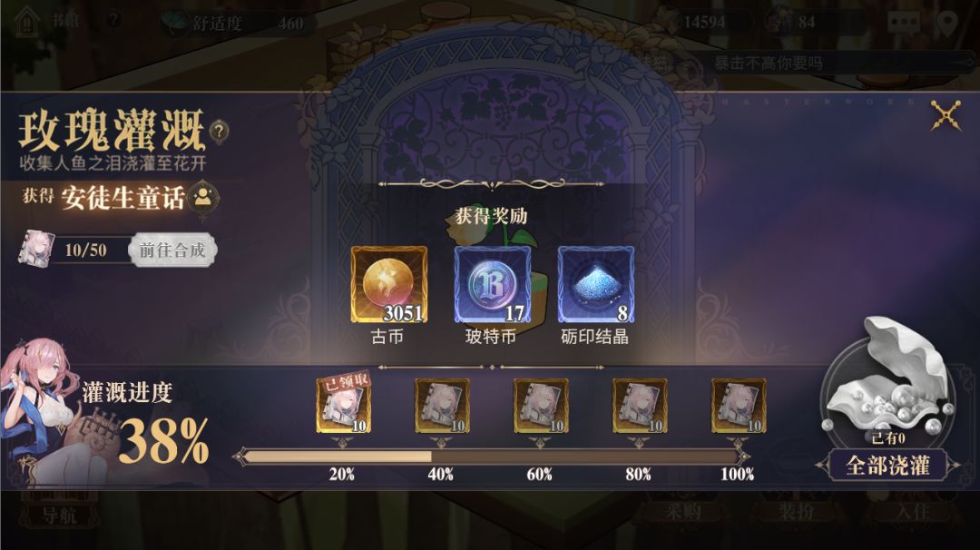 当我们在陈列大厅游玩量子骰子游戏时,从奖励点掉落以及商店中通过万面骰购买,我们可以获得道具“人鱼之泪”,而我们在推进第二世界的主线时,会掉落书界奇物“玫瑰”,它可以摆放在收藏室的永生童话展厅中,这朵玫瑰可以使用人鱼之泪进行浇灌,当浇灌程度达到100%时,就可以获得50个《安徒生童话》伊文缇尔的幻书残页,从而获得幻书了。