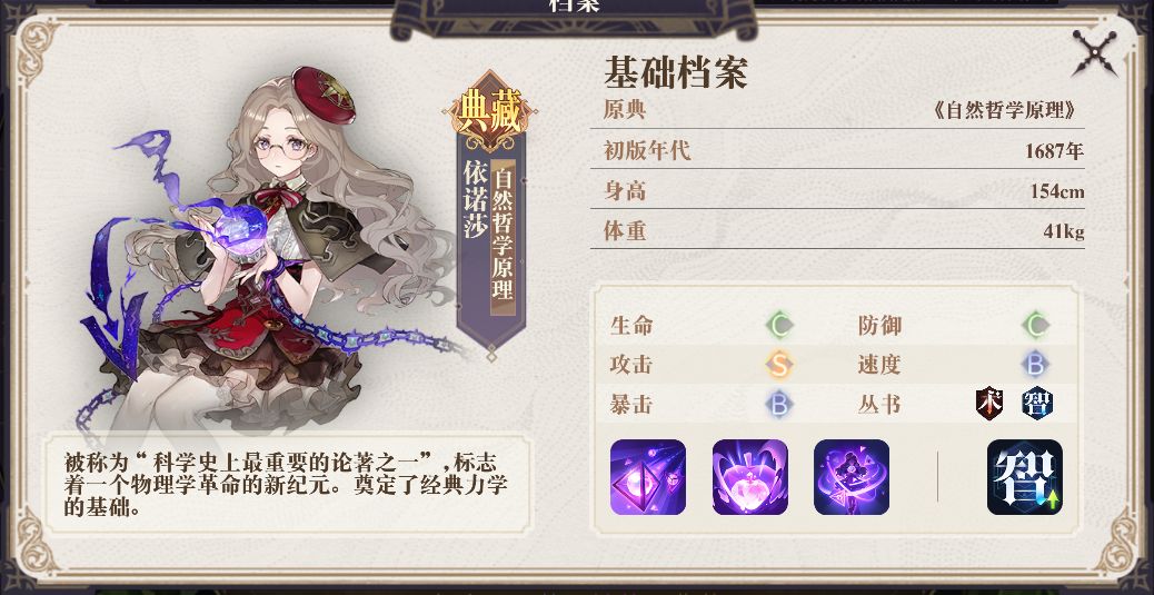 攻击S,生命和防御都是C,说明这《自然哲学原理》依诺莎是一本脆皮输出幻书,先看看她的技能吧。