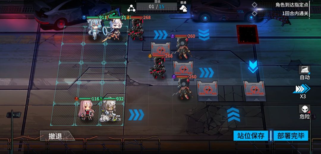 站位就是这样,上面两个下面两个(是谁都无所谓),只需要下面的依次踩加速带,上面一个人(我的是珞珈)打死一个怪后再次行动踩加速带就通关了!