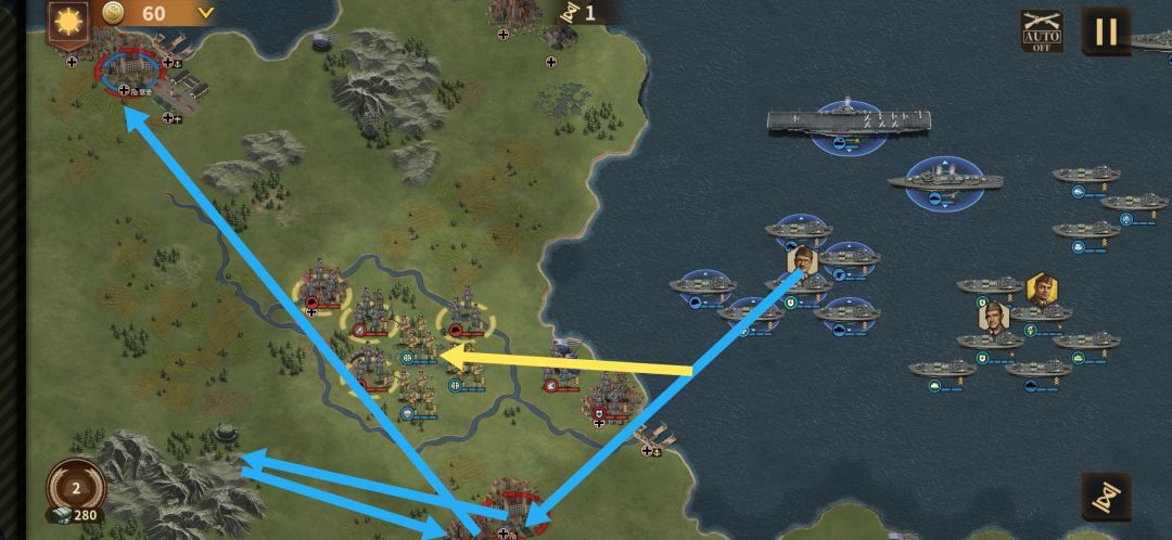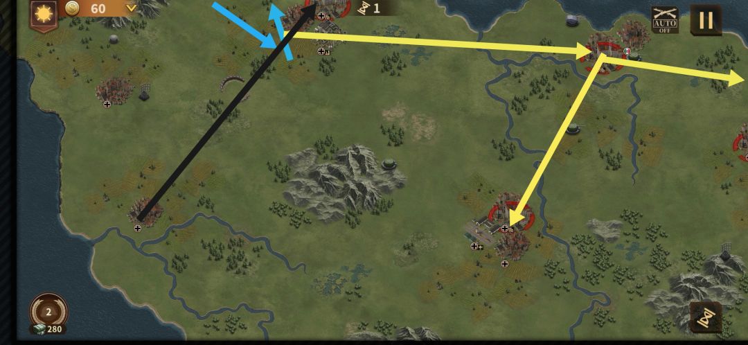 黄线为支援军路线,由散编步兵与后续援军组成,其作用为辅助占城,查漏补缺,解救伞兵。