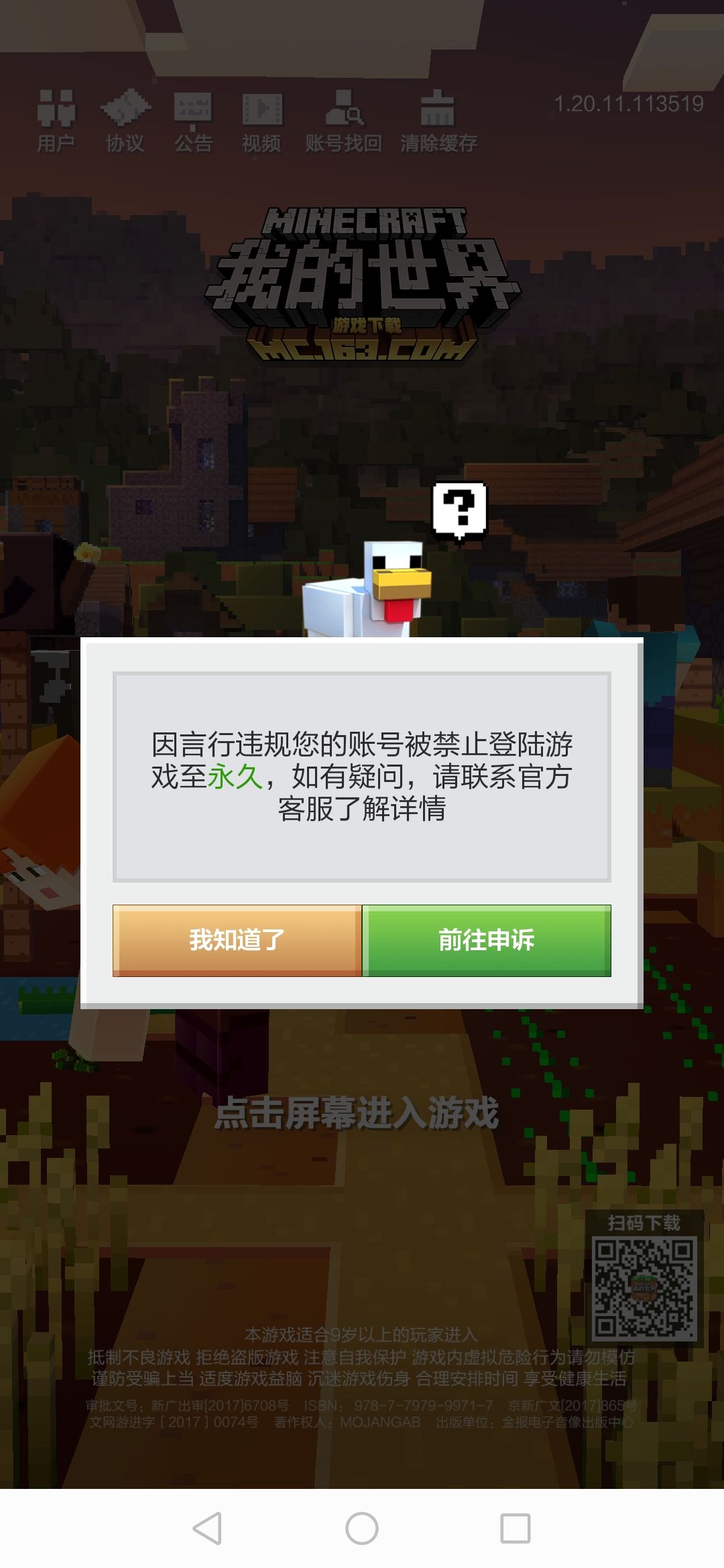 先我说下我的经历,我之前在华为应用商城里下了个我的世界,不出意外应该是渠道服加了料的,我在使用该账号在游戏内开自定义房间游玩时因为言行违规触发了系统禁言,弹出提示告知我被系统禁言了三个小时左右。