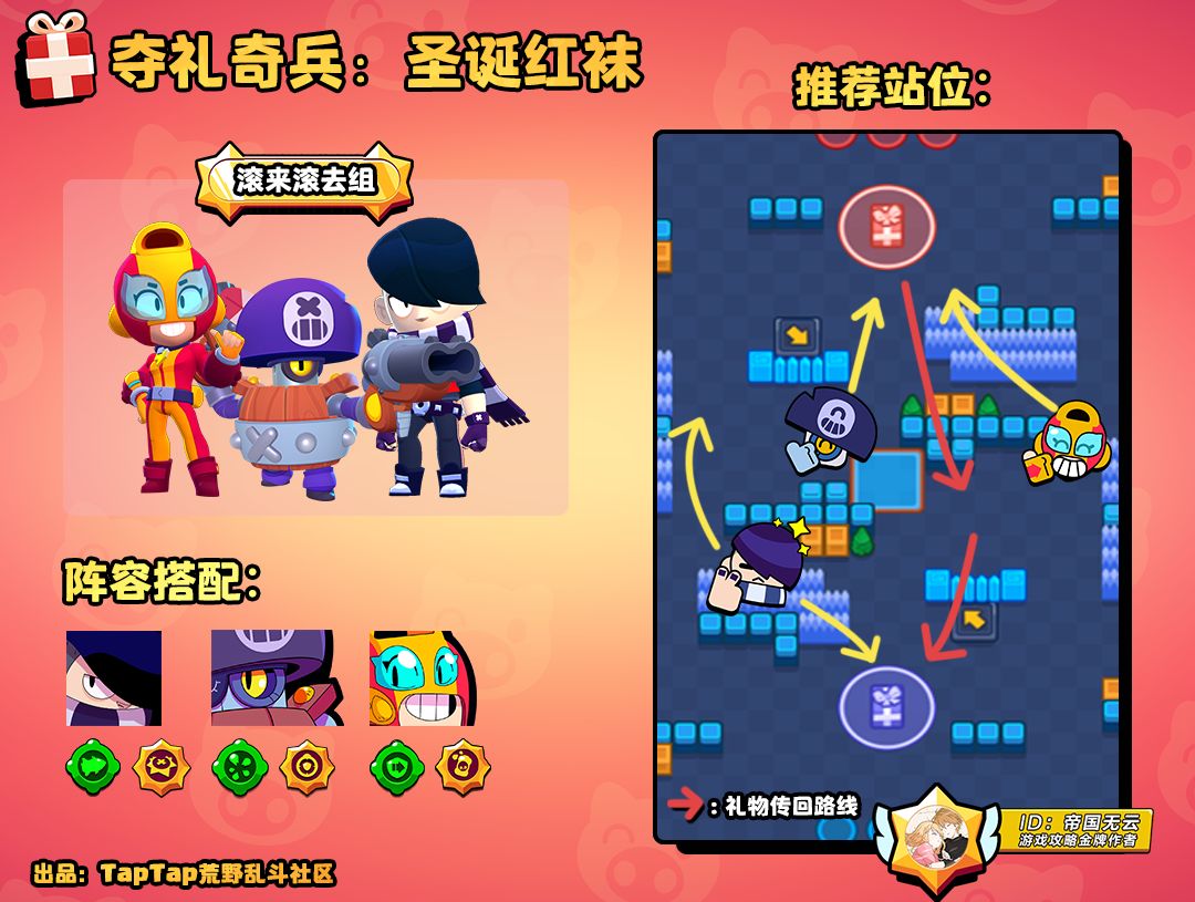 但拥有超级技能后伺机冲锋至礼物附近,在条件允许的情况下,可以将礼物,投过障碍物,也可交由队友传递。