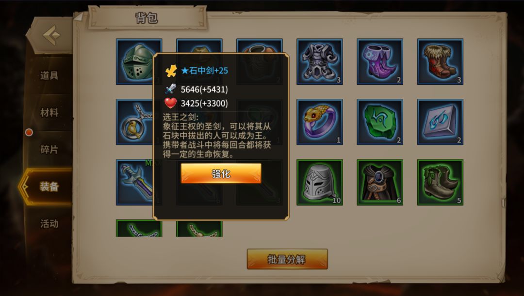 不过,有一个武器值得本球用单独的语言来介绍,他就是石中剑!介绍中是这样写的:象征王权的圣剑,可以将其从石块中拔出的人可以成为王。携带者战斗中将每回合都获得一定的生命恢复。而他本身具有的属性加成也是很不错的,增加215的攻击属性和125的生命属性,这只是基础属性,进行加成升级后可以做金色传说的平替!