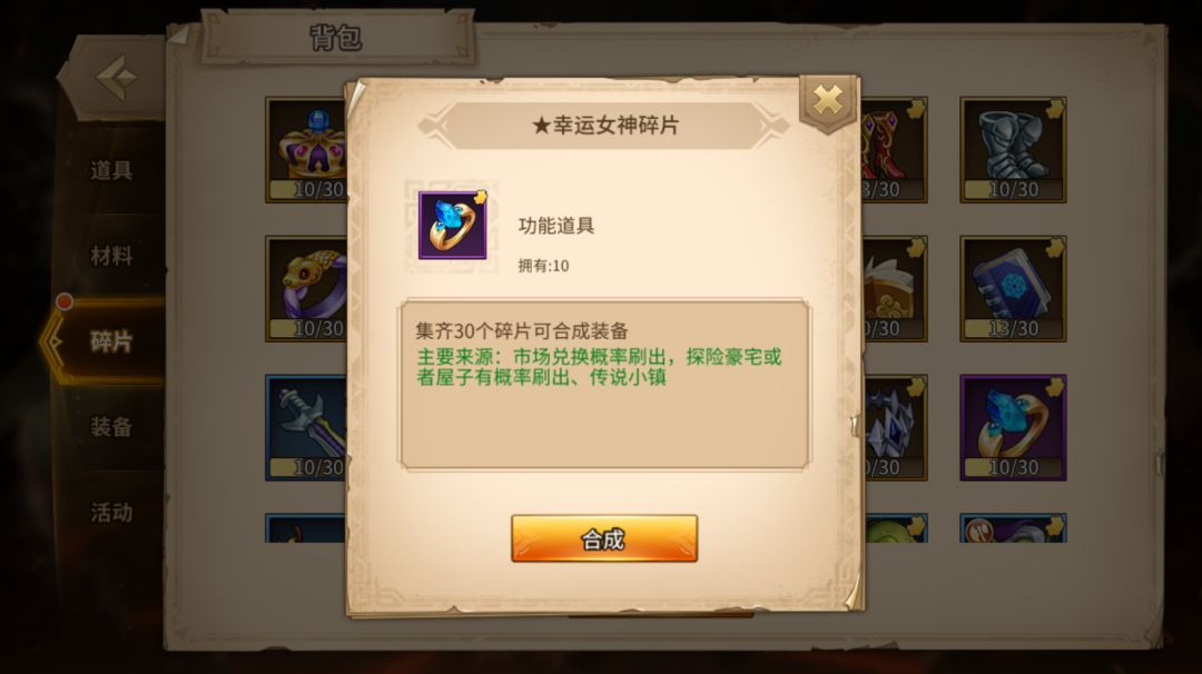 想要找到他们的装备碎片,有一个必定产出的地方就是传说小镇,幸运女神碎片可以在探险豪宅或者屋子中找到,除此之外,这个碎片和如意金箍棒碎片都可以在市场中概率刷出,而龙渊剑碎片有可能在打开好友送的礼物时惊喜发现哦~