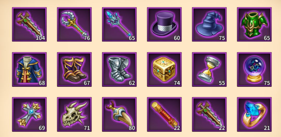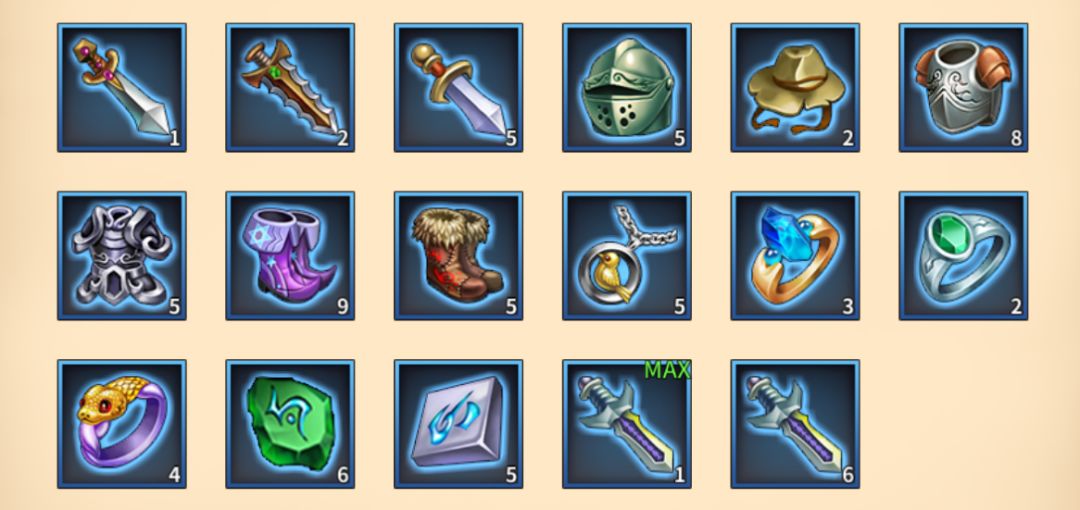 每个英雄有6个装备位,头部,躯体,鞋子、武器和两个饰品位,其中头、躯干、鞋子和武器能够构成一组套装,满足套装需求可拥有额外的属性加成!