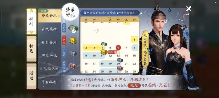 海量绑元,稀有外观等你来拿。活动期间1月8日~11日间任意一天登陆游戏,领取限定外观圣绣·天芒。还有更多好礼等着少侠来领取哦,游戏内点击宝箱查看活动时间。记得来领哦!!!