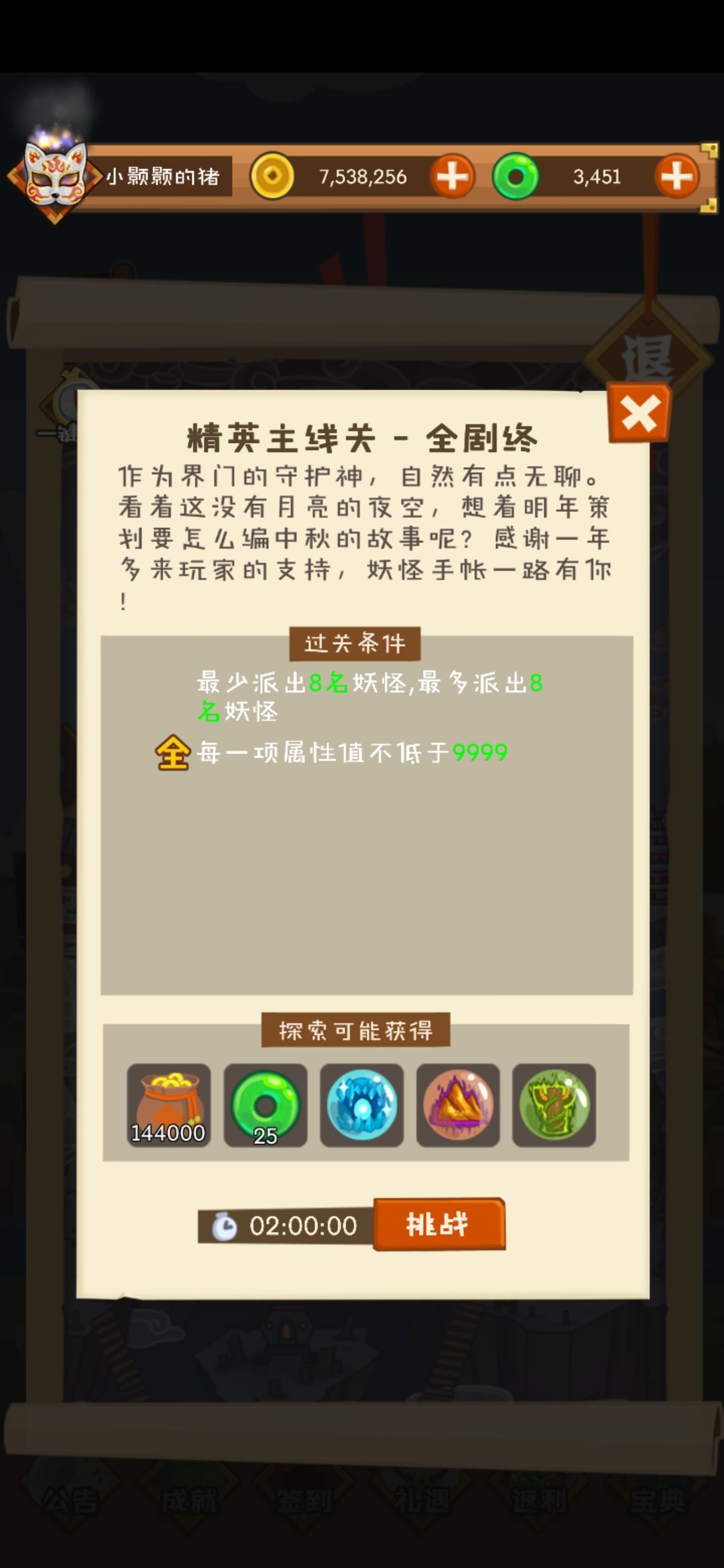 一年过去,我总算把剧情走完。能抽到的怪也从小两百个变成十几个。只有悟真塔还不是很如意。但确实很开心。一开始每一天都定时定点的收菜,到现在的随缘,看着仓库里再也没几个能升级的怪,然后想想自己的运气,池子里都抽了这么久还没出的那几个怪,啧啧啧。不过嘛这个游戏确实还行,除了某荣耀,每天就对这上心点。在此,感谢咱十三群的大佬派皇,三哥,hh等,对菜鸟真的不错。谢谢了。(♥)