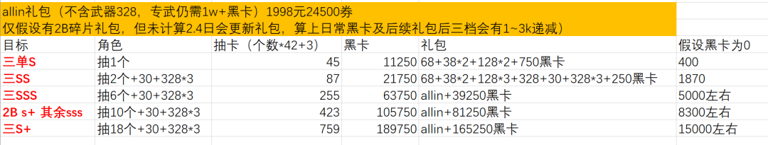 2)SS队伍:纯打算抽一队ss队伍的玩家其实在本次活动中最不划算,建议等2B礼包公布后再考虑。(由于本次A2抽取花费最少,ss队伍建议ss 2B + SS 9S + SSS A2,花费最少提升最大)