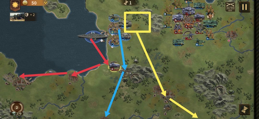 消灭黄圈后,我方增援到达战场,(归ai指挥)然后沿海岸行动,最终目标为左下红圈。