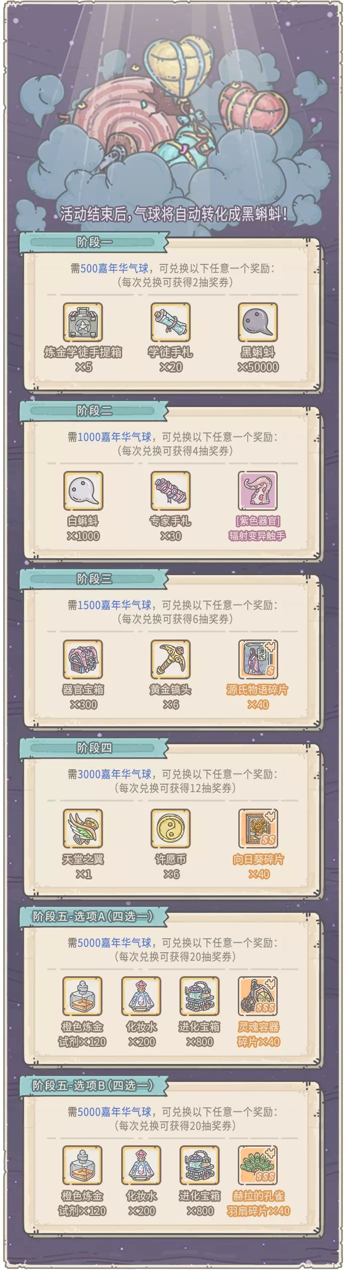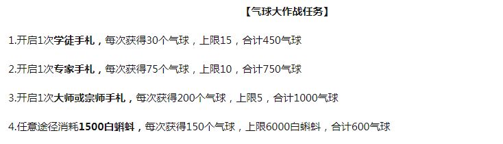 一般来讲只要囤点货基本可以拿到全部的气球,合计2800!白piao玩家顺其自然满400就参与,低于400的根据你的手札选择:学徒手札*1(30气球,上限15);专家手札*1(75气球,上限10);宗师/大师手札*1(200气球,上限5);任意消耗1500白蝌蚪,可获得150气球,上限6000白蝌蚪!抽奖积分这里推荐60积分、100积分、200积分、400积分,30-100积分奖励性价比较高,150积分奖励只比100积分多了一个许愿币,所以还不如抽到200