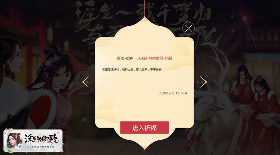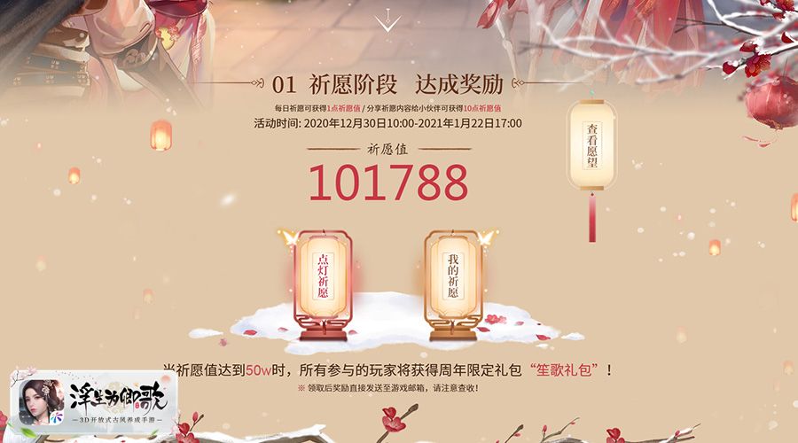 《浮生为卿歌》周年庆典正火热进行时,仪式感满满的祈愿活动等你前来参与,还有大量礼包奖励、限定称号静待阁下前来兑换领取!还不赶快叫上你的挚友,一起到《浮生为卿歌》中体验充满温度的古风人生吧!