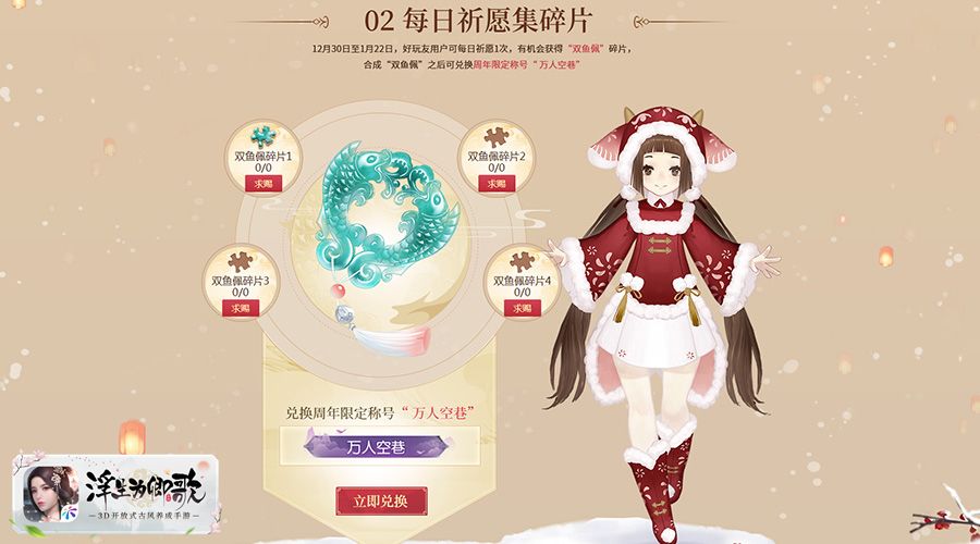 除祈愿活动和礼包外,周年庆期间,阁下完成指定收集任务,还能兑换周年庆限定称号“万人空巷”,求赠与赠送功能将助力阁下收集兑换碎片,并以全新面貌迎接即将到来的全新内容。《浮生为卿歌》愿下一个周年庆,依旧能有阁下相伴。
