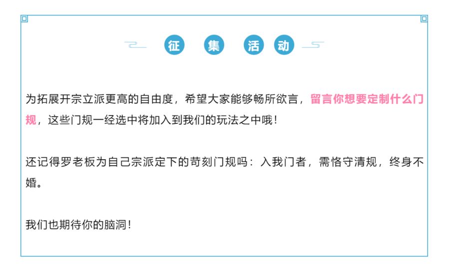 我们即将推出2021第一个年度重磅更新——开宗立派。在新年之际跟大家更多谈谈玩法设想,一起开个好头!