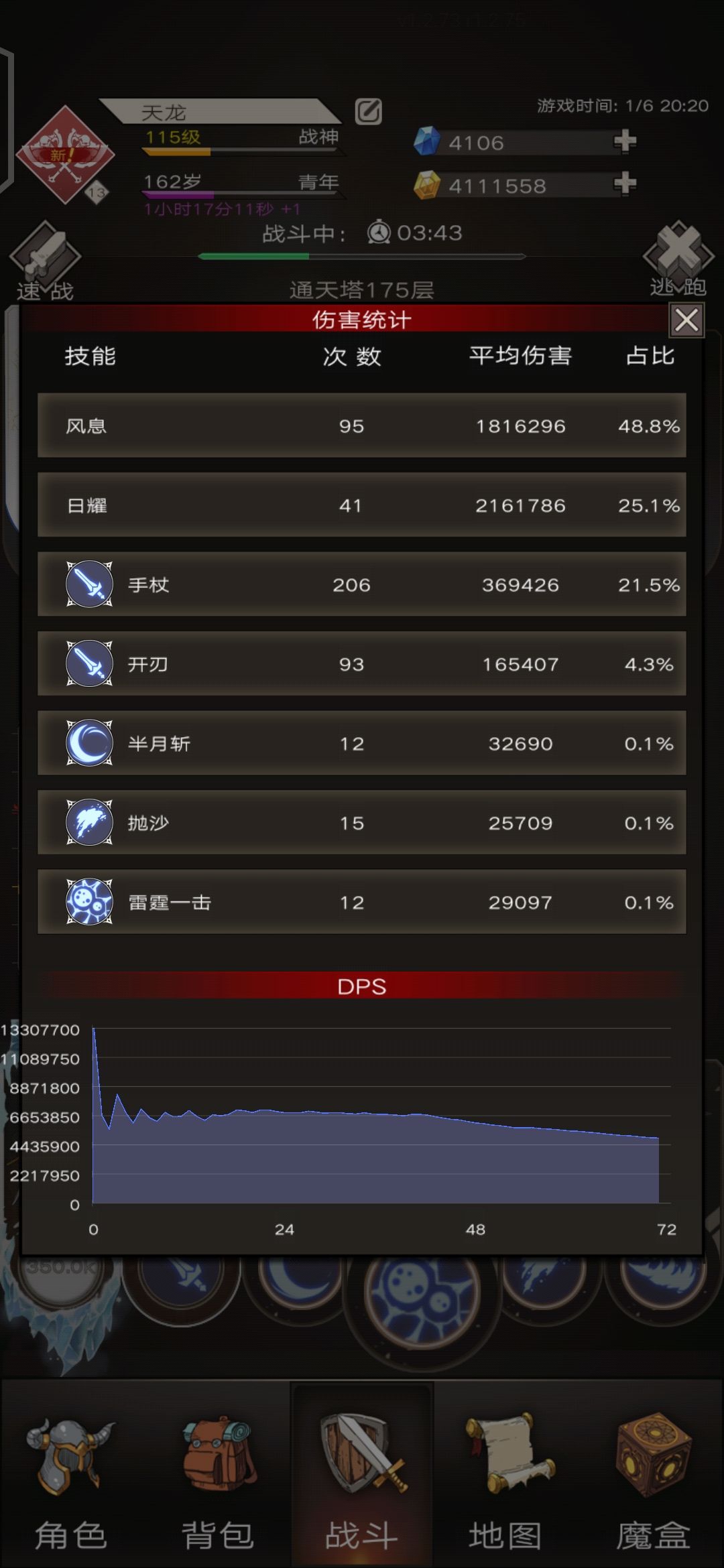 首先简单介绍一下这个流派,风息流,顾名思义是依靠风息打伤害的一个流派,依靠满闪避和阴寒之息的护盾生存,这个流派的优点就是可以适当舍弃暴击,爆伤,属性伤,伤害增幅这些属性,达到利用最少的资源达到最大化得效果,缺点,怪减伤不高的时候表现不明显,下面是通关175的装备和伤害占比图,披风还没来的急洗练和铭刻,装备也没有铭刻治疗,武器是16,这套装备通关175足以证明强度了。