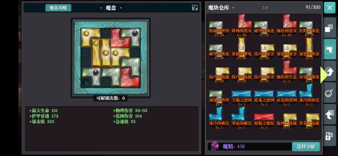再就是法盘魔块,跳坑暴击,暴潜!没血了转半圈,爆回,暴潜!其他的就放黑色的堆范围!魔块升十级的时候要10块同颜色的,升30级的时候要20块(相同颜色相同形状的画重点)!