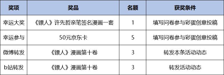 欢迎各位镖客大人踊跃参加~团长给大家准备了一套许先哲老师亲笔签名的《镖人》漫画和50元京东卡作为奖励,而且优秀的创意还有可能在游戏中实现哦~