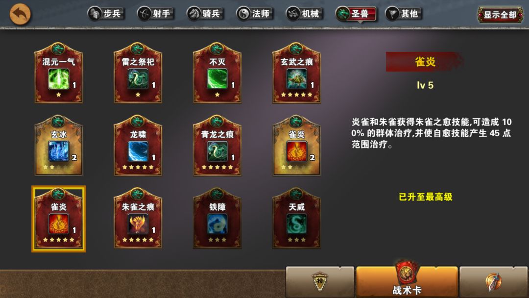 雀炎,朱雀获得朱雀之愈,可造成100%的全屏全体群回血,4回合cd,同时自愈可形成1格的范围治疗。