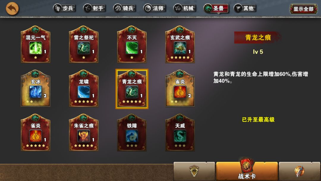 青龙在搭配了双卡后,3道雷击就是3*50%=150%伤害,打不反击就是150%伤害,因此最大化的伤害就是300%,非常可观。而吸血,150%*20%=30%,相当于攻击力的30%吸血。加上基础攻击强力,不亏是最强大的兵种。